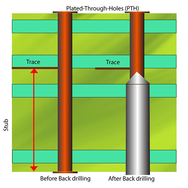 - Backdrilling avlägsnar överflödig koppar och behåller endast de nödvändiga anslutningssegmenten för att förbättra signalintegriteten.